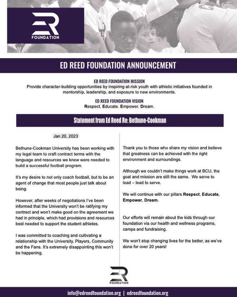 Ed Reed Statement On Bethune-Cookman